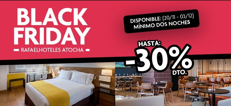 Hasta el 03 diciembre 2025, aprovecha la oferta BLACK FRIDAY exclusiva para usuarios de nuestra web y reserva tu próxima estancia con un Descuento exclusivo del 30% desde el 20/11 2025 al 15/03 2026; a partir del 16/03 2026, descuento de un 15% sobre el tipo de habitación que selecciones al efectuar tu reserva en RafaelHoteles Atocha